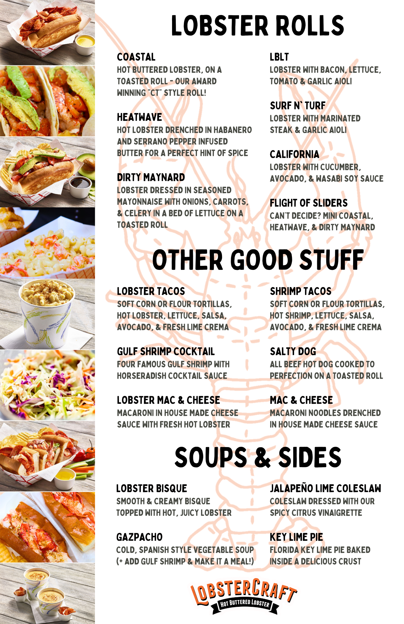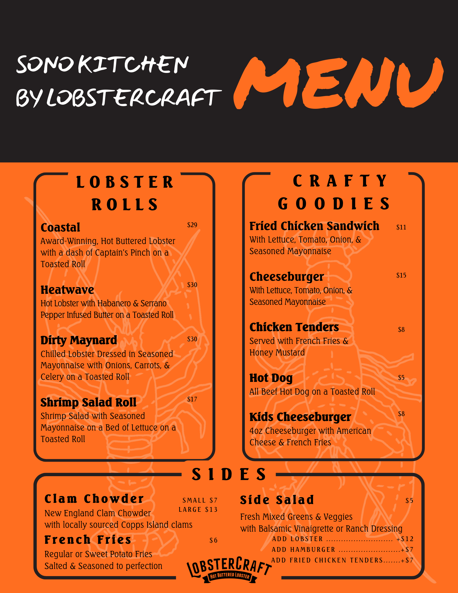 In August of 2022 I became the Director of Advertising & Marketing for a local restaurant chain LobsterCraft. I used my previous knowledge in advertising, marketing, web design, and combined it with their need for graphic design. Luckily, with my technical and creative skills I picked it up quickly. I designed everything for the company in-house from printed menus, large printed banners, social media content, and advertising materials. Learning the art of graphic design taught me a deeper look into type, color, and composition. I was able to create branded promotional content that was eye-catching and brought in a large crowd of new faces to our restaurants. As well, I was able to create a BrandBook with all of these elements to be implemented in further designs. Therefore, guiding all promotional materials to fit with the overall brand messaging.